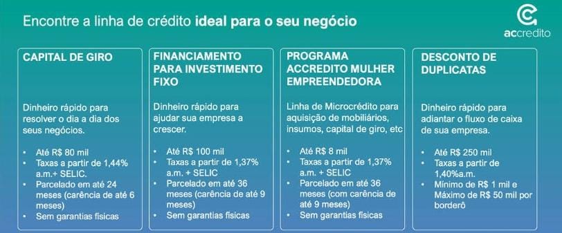 Entre as soluções voltadas para atender as necessidades das empresas, a fim de apoiar os objetivos e crescimento de negócios, a ACCREDITO conta com linhas de crédito, financeiro nas modalidades de empréstimo para capital de giro, financiamento para investimentos, antecipação de recebíveis de vendas à vista ou a prazo e cartões.